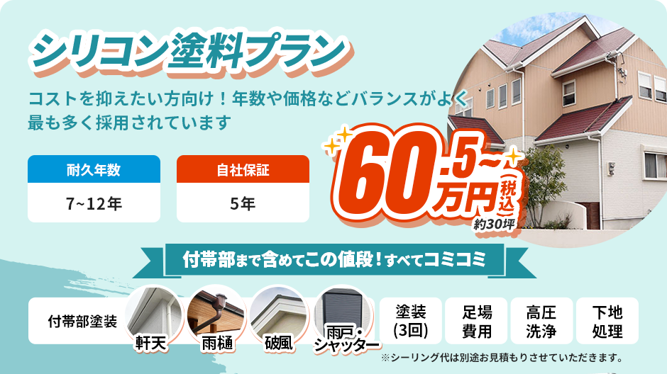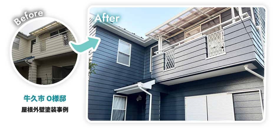 塗装は、最適な基準塗布量と塗装面積で材料費が決まりますが同じ平米数でも建物の形状により塗装面積は異なります。牛久建装では、お客様に安心してご依頼いただけるよう、「税込」金額・「坪」単位で、さらに雨樋などの外壁以外の付帯部を含めた金額で工事費用目安をお出ししております。