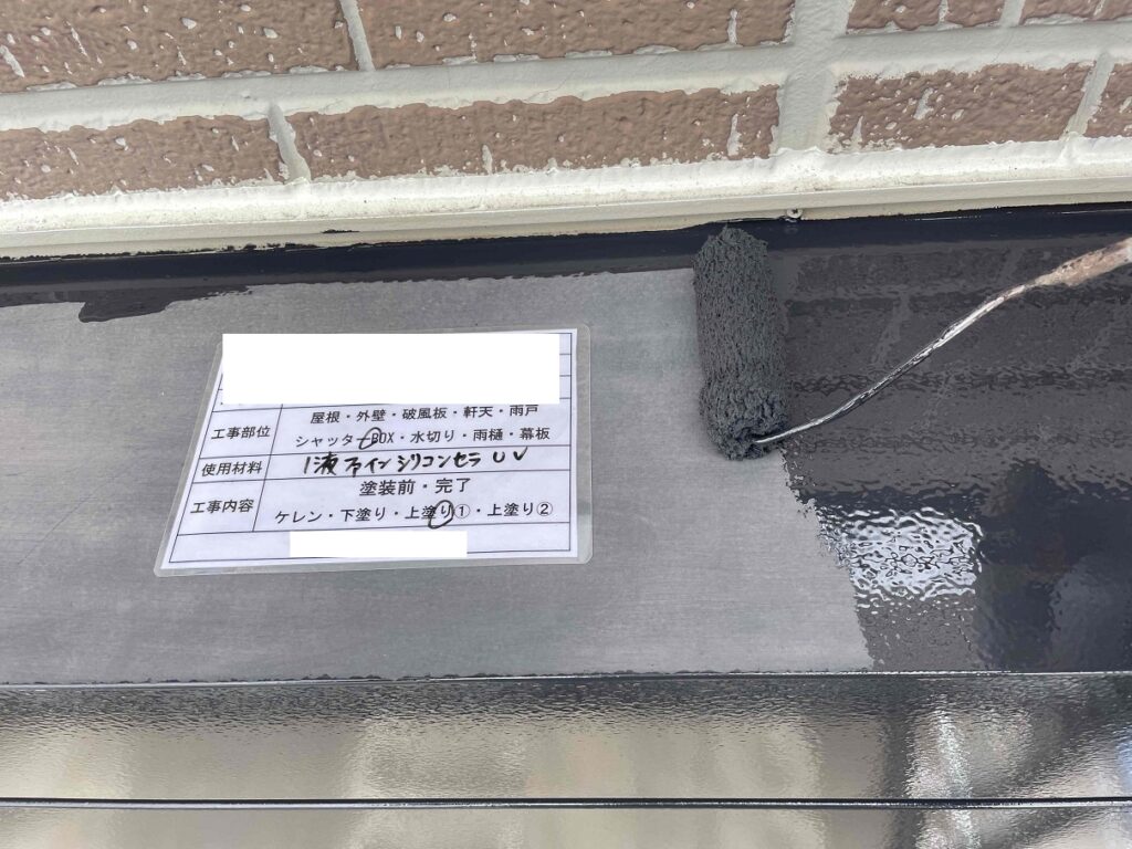 外壁はしっかり下塗りを行い、濃いグレー系の塗料を上塗り2回施工し、その上にうすいグレー系の塗料を重ね塗りし、ダブルトーン施工していきます。