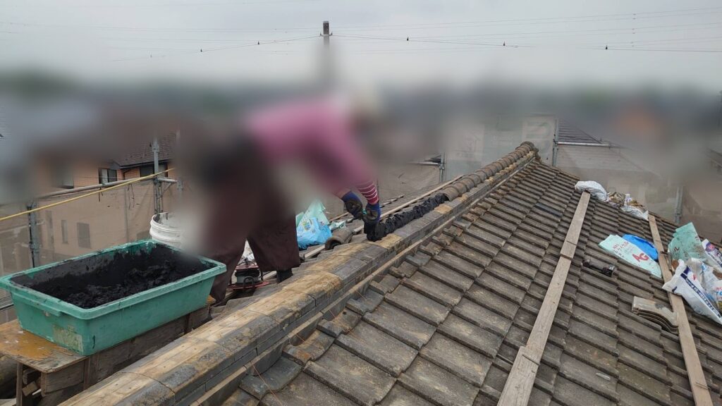 棟瓦は葺き戻し工事を行い、軒天腐食部は撤去し、補修をしました。屋根は苔や変色が目立つので、しっかり洗浄して汚れを落とし、丁寧に施工します。