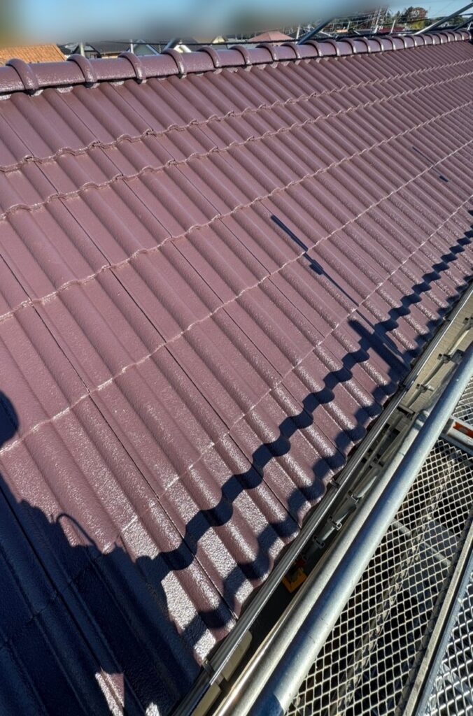 屋根は苔・変色・劣化を洗浄塗装で解消し、ニューワイン色で美しく耐久性を向上。