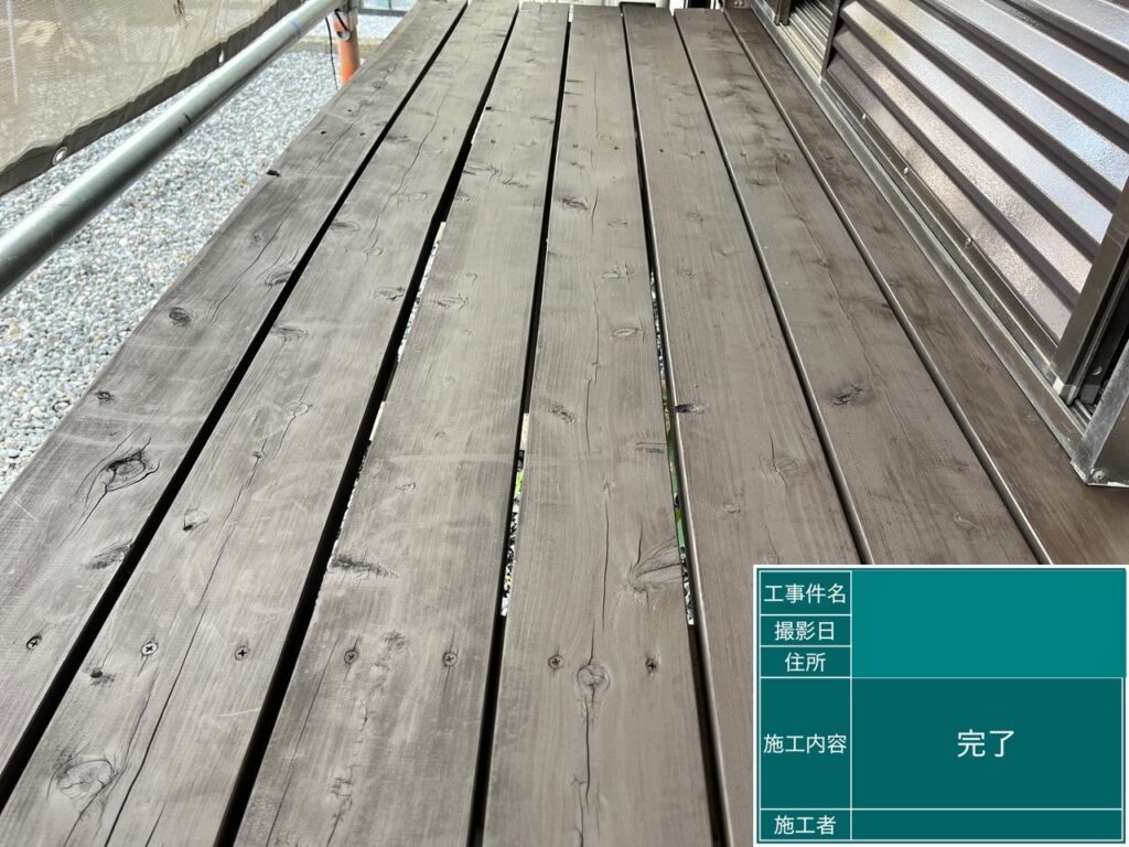 ウッドデッキはケレン作業で旧塗膜や汚れを除去し、下地を整えたうえで中塗り・上塗りを施工。